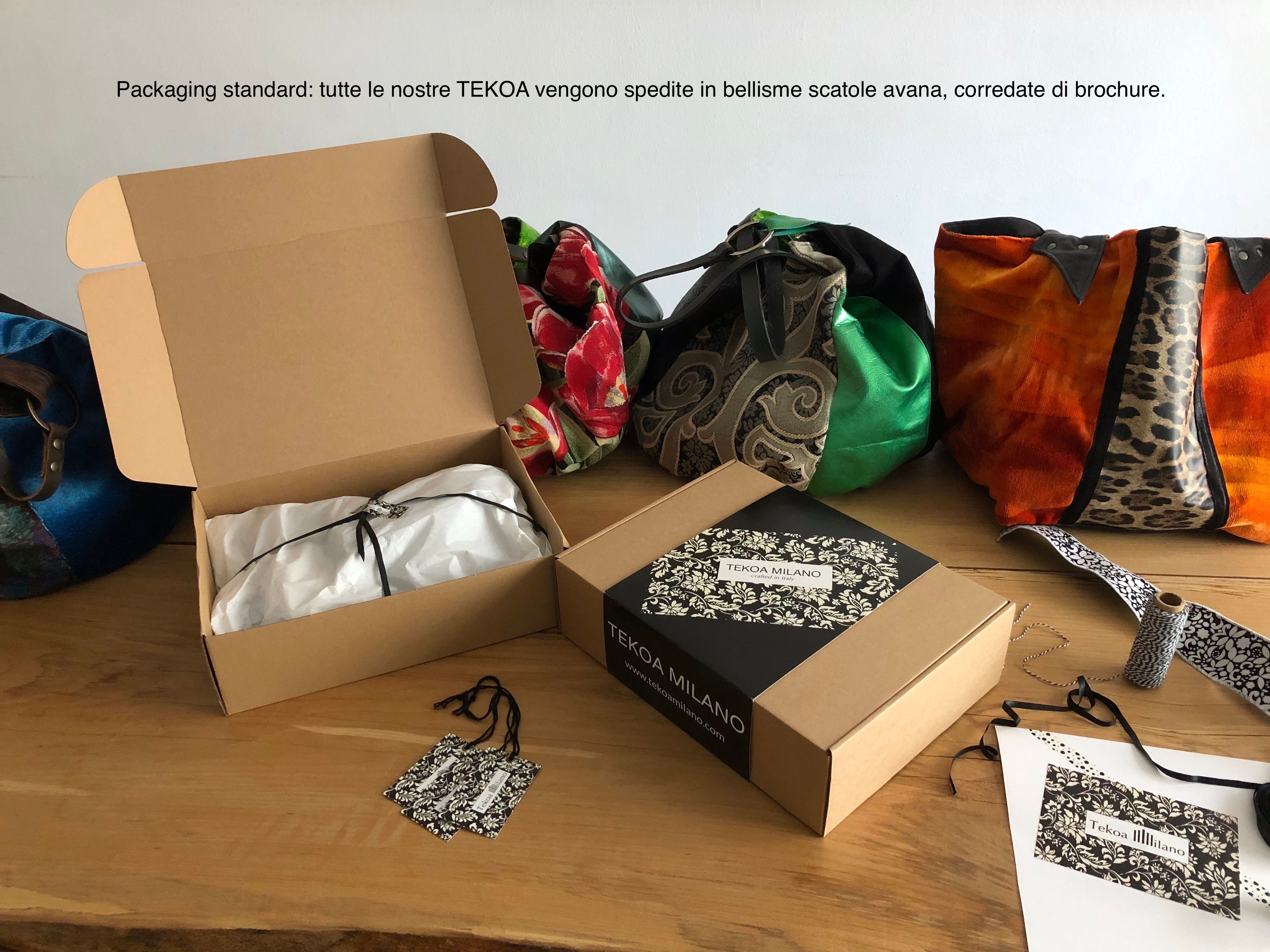 Una TEKOA è sempre un dono meraviglioso e arriva con un packaging standard molto bello, ma se vuoi rendere il tuo regalo una esperienza indimenticabile puoi scegli una Confezione Regalo DeLuxe: una cappelliera decorata con fiori di seta e nastri in tessuto. In questa categoria trovi alcuni esempi, ma puoi sempre contattarci per chiederci colori, forme e decorazioni particolari. Contattaci via mail tekoa.borse@gmail.com o telefonicamente al +39 3331207778 per personalizzare il tuo ordine.
